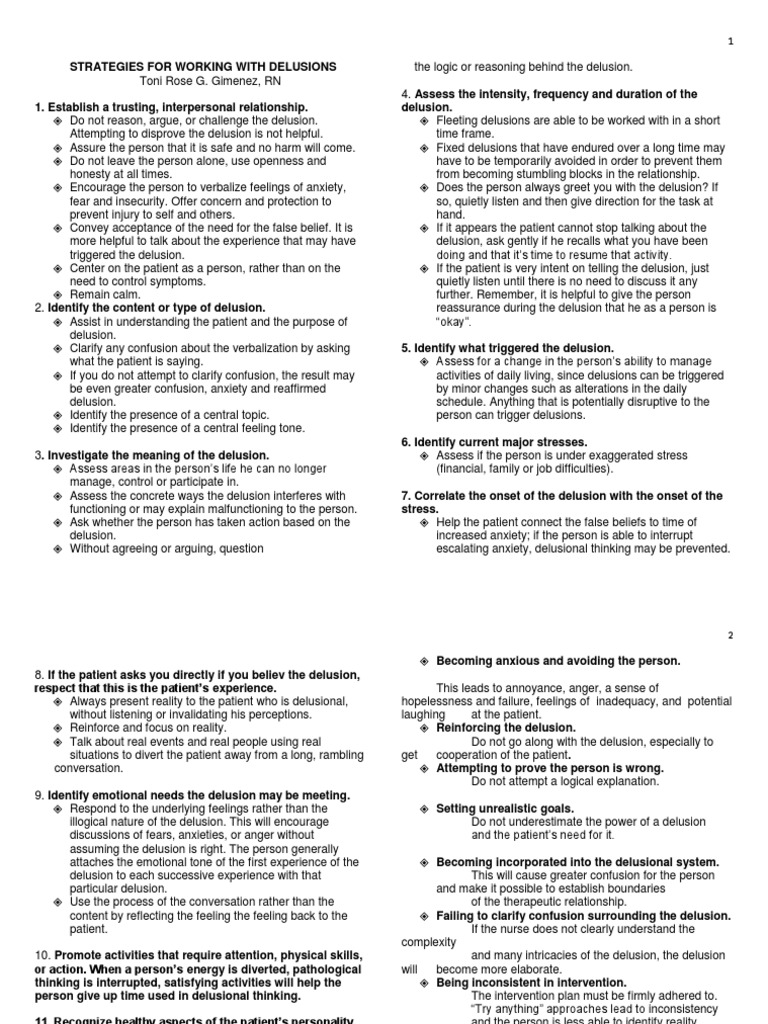 Examples Of Coping Strategies For Persistent Symptoms Download Table from www.researchgate.net Keep a diary of the voices to help identify and avoid the situations in which they arise. However, when managed appropriately, caregivers can help their loved ones to stay calm and make their own job less stressful. 10 signs someone has delusions 1. One of the worst things you can do if you think a loved one is having delusions is to ignore it. People with this condition will rarely admit that their beliefs are delusions or are problematic, and will therefore rarely seek out treatment. It may feed some paranoid delusions, and you may lose all the trust you have built so far. As for what to say, i would encourage the person to seek help. When someone declared to him that it was not a concern to him, this delusion shifted into believing that he was an fbi agent sent on a mission to rescue people from ice and the government was.